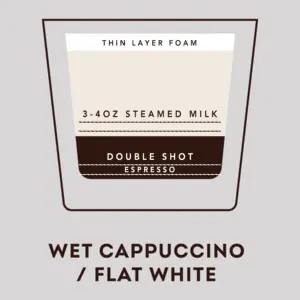 A wet cappuccino (Flat White) is a harmonious balance of espresso, steamed milk, and a light layer of milk foam. With a creamier texture than its traditional counterpart, it offers a smoother and more indulgent experience while retaining the essence of the classic cappuccino.